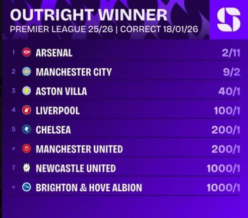 1 - 维拉失利送阿森纳扩大领先,枪手夺冠赔率断崖式领跑 本轮英超,争冠形势发生决定性变化。阿斯顿维拉主场0-1爆冷不敌埃弗顿,而尽管榜首阿森纳自己也只是0-0战平诺丁汉森林,但却因此将领跑优势扩大到了7分。 权威机构随即更新了夺冠概率,阿森纳的概率低至2/11(不低了),呈现断崖式领先,曼城则升至9/2,维拉和利物浦已分别达到40/1和100/1。这7分差距在赛季后期意味着巨大的心理和实际优势,阿森纳已被普遍视为本赛季英超冠军的最大热门。