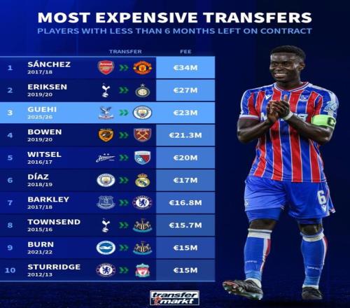 1. 桑切斯 17-18赛季 阿森纳>>曼联 3400万欧元 2. 埃里克森 19-20赛季 热刺>>国米 2700万欧元 3. 格伊 25-26赛季 水晶宫>>曼城 2300万欧元 4. 鲍恩 19-20赛季 赫尔城>>西汉姆联 2130万欧元 5. 维特塞尔 16-17赛季 泽尼特>>天津权健 2000万欧元 6. 卜拉欣-迪亚斯 18-19赛季 曼城>>皇马 1700万欧元 7. 巴克利 17-18赛季 埃弗顿>>切尔西 1680万欧元 8. 汤森 15-16赛季 热刺>>纽卡 1570万欧元 9. 丹-伯恩 21-22赛季 布莱顿>>纽卡 1500万欧元 10. 斯图里奇 12-13赛季 切尔西>>利物浦 1500万欧元 【上咪咕独家看英超】 |