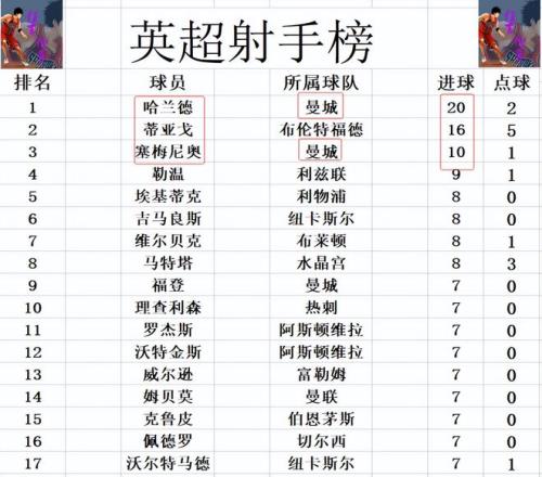 射手榜方面,哈兰德20球领跑,蒂亚戈16球位列第2,塞梅尼奥10球排在第3。勒温9球排第4,福登,理查利森,姆贝莫和沃特金斯等人7球刚好挤入前十。 |