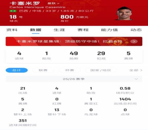 体育播报01月23日宣 曼联官方消息,卡塞米罗将在赛季末合同到期后离开球队! 曼联官方公告: 随着合同今夏到期,卡塞米罗将正式离开曼彻斯特联足球俱乐部。 这位传奇中场已为红魔效力四个赛季,截至目前代表球队出战146场比赛,贡献21粒进球。 作为名副其实的冠军收割机,卡塞米罗于2022年8月在老特拉福德正式亮相。凭借硬朗的球风以及关键时刻的破门能力,他迅速收获球迷的喜爱。 这位巴西国家队队长曾助力曼联夺得2023年联赛杯冠军。在对阵纽卡斯尔联的关键战役中,他头球建功,全场表现无可挑剔。2024年,这位33岁的中场大将又随队捧起英格兰足总杯冠军奖杯。