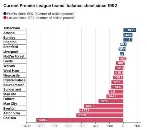 据《邮报》报道,英超时代各俱乐部累计亏损总计已超49亿镑,只有热刺、阿森纳和利物浦等队实现盈利。自1992年以来,英超俱乐部总共亏损达到了49.9亿英镑,其中90%由10家俱乐部贡献。切尔西是亏损最多的,他们英超时代的亏损超12亿英镑,主要在阿布时代。此外,维拉亏损了6.779亿镑,埃弗顿亏损6.331亿镑,曼城亏损也达到了5.697亿镑。曼联亏损为2.441亿镑。自1992年以来,曼城每亏损2600万英镑就能赢得一座奖杯,切尔西每亏损4500万英镑就能赢得一座奖杯。热刺盈利最多,但他们在此期间只赢得了两座联赛杯和一座欧联杯。如果你以可持续的成功来衡量一个俱乐部,那么阿森纳就是最可以昂首挺胸的俱乐部。 他们曾三次捧起英超奖杯,此外还赢得了九座足总杯、一座联赛杯和一座欧洲优胜者杯,总共盈利1.324亿英镑,盈利仅低于热刺。利物浦的运营一直保持稳健,并且实现了1200万镑盈利。1992年以来英超球队盈亏排行: 1.热刺:+1.832亿镑 2.阿森纳:+1.324亿镑 3.伯恩利:+1.31亿镑 4.布莱顿:+4610万镑 5.布伦特福德:+3120万镑 6.利物浦:+1200万镑 7.森林:-6110万镑 8.利兹联:-1.091亿镑 9.狼队:-1.214亿镑 10.西汉姆:-1.351亿镑 11.纽卡:-1.481亿镑 12.水晶宫:-1.716亿镑 13.伯恩茅斯:-1.744亿镑 14.桑德兰:-2.11亿镑 15.曼联:-2.441亿镑 16.富勒姆:-3.576亿镑 17.曼城:-5.697亿镑 18.埃弗顿:-6.331亿镑 19.维拉:-6.779亿镑 20.切尔西:-12.567亿镑 今日(1.24) 08:30 NBA常规赛 太阳 - 老鹰 08:30 NBA常规赛 凯尔特人 - 篮网 08:30 NBA常规赛 国王 - 骑士 09:00 NBA常规赛 鹈鹕 - 灰熊 09:00 NBA常规赛 步行者 - 雷霆 09:00 澳网男单第3轮 斯皮兹里 - 辛纳 09:30 澳网女单第3轮 诺斯科娃 - 王欣瑜 10:00 NHL常规赛 华盛顿首都人 - 卡尔加里火焰 10:30 NBA常规赛 掘金 - 雄鹿 11:00 NBA常规赛 猛龙 - 开拓者 14:00 澳网男单第3轮 瓦林卡 - 弗里茨 16:00 LCK杯小组赛 HLE - DNS 16:00 澳网男单第3轮 范德尚舒普 - 德约科维奇 16:00 澳网女单第3轮 卡琳斯卡娅 - 斯瓦泰克 16:00 澳网女单第3轮 莱巴金娜 - 瓦伦托娃 16:30 中国排球超级联赛-女子第11轮 北京北冰洋 - 福建安溪铁观音 17:00 LPL第一赛段登峰组 TES - AL 17:30 澳网男单第3轮 西里奇 - 鲁德 18:30 LCK杯小组赛 DK - GEN 19:00 LPL第一赛段登峰组 WBG - JDG 19:35 CBA常规赛 广东 - 山西 19:35 CBA常规赛 北京 - 北控 19:35 CBA常规赛 天津 - 吉林 20:30 英超第23轮 西汉姆联 - 桑德兰 21:00 西甲第21轮 巴列卡诺 - 奥萨苏纳 22:00 意甲第22轮 科莫 - 都灵 22:30 德甲第19轮 勒沃库森 - 不莱梅 22:30 德甲第19轮 拜仁慕尼黑 - 奥格斯堡 22:30 德甲第19轮 法兰克福 - 霍芬海姆 22:30 德甲第19轮 海登海姆 - RB莱比锡 22:30 德甲第19轮 美因茨 - 沃尔夫斯堡 23:00 U23亚洲杯决赛 中国男足U23 - 日本U23 23:00 英超第23轮 伯恩利 - 热刺 23:00 英超第23轮 富勒姆 - 布莱顿 23:00 英超第23轮 曼城 - 狼队 23:15 西甲第21轮 瓦伦西亚 - 西班牙人 23:30 荷甲第20轮 阿贾克斯 - 福伦丹 明晨(1.25) 00:00 法甲第19轮 雷恩 - 洛里昂 01:00 土超第19轮 卡拉古拉克 - 加拉塔萨雷 01:00 意甲第22轮 佛罗伦萨 - 卡利亚里 01:00 NBA常规赛 奇才 - 黄蜂 01:30 沙特联第18轮 新未来城体育 - 吉达国民 01:30 德甲第19轮 柏林联合 - 多特蒙德 01:30 西甲第21轮 塞维利亚 - 毕尔巴鄂竞技 01:30 英超第23轮 伯恩茅斯 - 利物浦 02:00 葡超第19轮 阿罗卡 - 葡萄牙体育 02:00 法甲第19轮 勒阿弗尔 - 摩纳哥 03:00 荷甲第20轮 埃因霍温 - 布雷达 03:45 意甲第22轮 莱切 - 拉齐奥 04:00 西甲第21轮 比利亚雷亚尔 - 皇家马德里 04:00 NBA常规赛 尼克斯 - 76人 04:05 法甲第19轮 马赛 - 朗斯 05:00 足球友谊赛 洛杉矶FC - 奥兰治县布鲁斯 06:00 足球友谊赛 迈阿密国际 - 利马联盟 06:30 NBA常规赛 勇士 - 森林狼 |