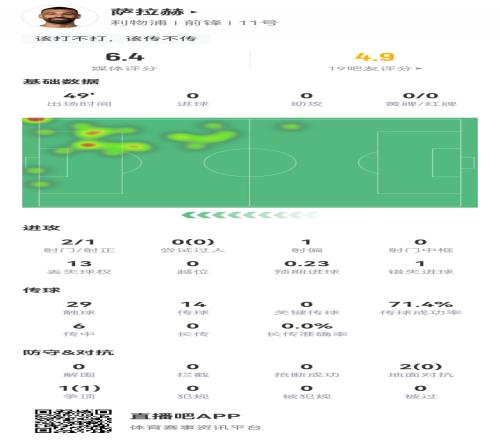 萨拉赫半场数据表现:2次射门1次射正,丢失13次球权