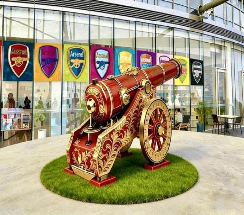 根据统计,阿森纳在全球主要社交媒体拥有 1.4 亿粉丝,在中国也是最受欢迎的英超俱乐部之一。当这家英超顶级俱乐部的艺术展览落户上海中心 52 楼,一家原本主打静谧的书店瞬间增添了运动潮流气息。位于好望南角 C 位的 “三狮枪手” 红色加农炮装置,既溯源阿森纳百年兵工厂的经典传承,也是对酋长球场门前标志的艺术化复刻。炮轮上的人形装饰,则凝练了阿森纳各个时代传奇球员的风采。