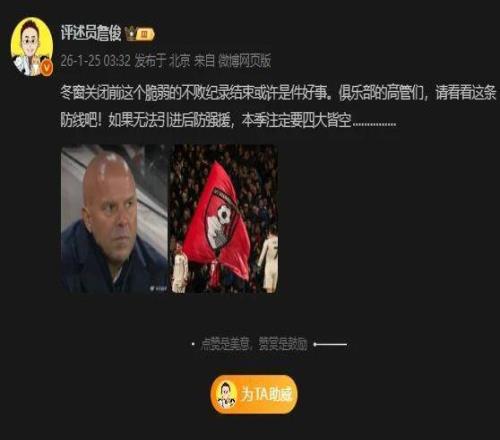 北京时间1月25日,英超第23轮,利物浦客场2-3惨遭伯恩茅斯绝杀,进入2026年以来英超还未赢过。本场比赛,利物浦在客场一度0-2落后对手,但靠着范戴克的角球破门和索博的80分钟的任意球破门一度扳平比分。比赛90+4分钟,伯恩茅斯利用界外球机会,由阿德利打入制胜一球。最终,伯恩茅斯3-2绝杀利物浦,终结对手各项赛事13场不败的纪录。