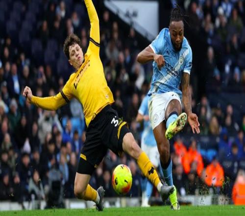 狼队22轮过后只拿到了8个积分,但最近4轮,狼队1胜3平保持不败,近4轮拿到的分数比曼城还多。 开场之后,曼城就大举压上,开启了传控的压迫性打法,狼队防守有些顾此失彼。第6分钟,努内斯边路没有任何调整,直接传球,狼队中卫准备头球解围,被马尔穆什抢先一脚,将球打进。