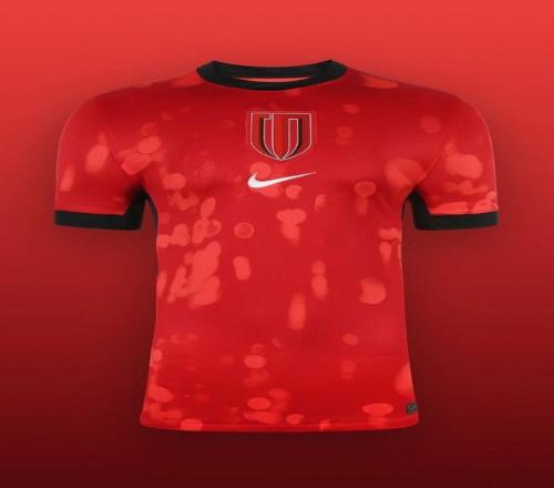 新赛季成都蓉城主场球衣以城市夜色为灵感,整体以红色为主,辅以黑色细节点缀,将流动的光影转化为遍布全身的虚化光斑图案,营造出动态视觉效果。