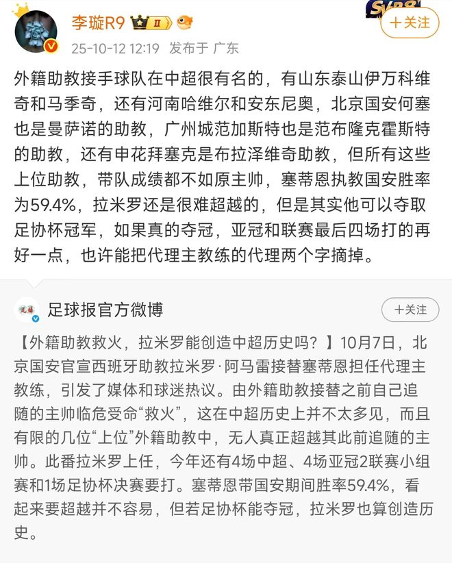 北京时间10月12日,中超联赛目前仅剩四轮,北京国安虽然落后领头羊上海海港6分,以51分暂居积分榜第4,但是北京国安依然存在夺冠的希望,而且北京国安在近期换帅后,也有望迎来强势反弹。 要知道,北京国安作为本赛季的中超半程冠军,以及闯进足协杯决赛,此前一度被视作本赛季双冠王的有力争夺者,但是自从0-6惨败山东泰山后,北京国安也是瞬间跌入低谷,先后又不敌河南队、上海海港,这也导致北京国安在中超争冠路上失去了主动权。 加上在亚冠赛场遭遇1平1负,北京国安只能是与塞蒂恩说再见,而与以往不同,北京国安此次并未让本土教练出任救火教练,而是让塞蒂恩助手拉米罗来出任代理主帅,而北京国安此举也是创造了历史,因为北京国安此前让外籍助教上位“救火”。 值得注意的是,尽管拉米罗此前是塞蒂恩的助手,但是他与塞蒂恩的执教理念不同,尤其是在技战术打法方面,两人存在一定的分歧,而且从北京国安近期的公开训练课来看,拉米罗已经让北京国安改踢四后卫,并且抛弃了一定的传控打法。 但是据《足球报》介绍,塞蒂恩此前执教北京国安期间的胜率高达59.4%,拉米罗想要超过塞蒂恩存在一定的难度,但是拉米罗只要带队拿到足协杯冠军,他依然会创造历史,并且有望被扶正。 对此,《足球报》总编李璇在个人社媒进行了分析,表示拉米罗只要带领北京国安夺取足协杯冠军,然后再把亚冠和联赛最后四场打的再好一点,拉米罗也许能把代理主教练的“代理”两个字摘掉。 值得注意的是,北京国安本年度还剩余9场比赛,其中有4场中超,4场亚冠2小组赛,以及1场足协杯决赛,也就是说,拉米罗只要带队战胜河南队,拿到本赛季的足协杯冠军,然后再踢好其余8场比赛,拉米罗就有望被北京国安彻底扶正,成为北京国安正式主帅。 但是不得不说的是,在河南队近期上升势头明显,以及阿奇姆彭火力全开的情况下,北京国安想要击败河南队拿到足协杯冠军并不容易,而且最后四场中超联赛,北京国安面对的均是保级球队,所以拉米罗想要被扶正并不容易,对此,你是如何看待的呢?欢迎在评论区留言、探讨! |