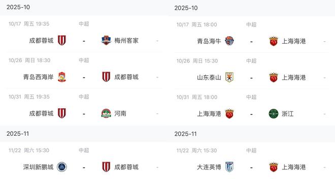 仅落后上海海港2分排在积分榜第2的成都蓉城,他们接下来将会先后对阵梅州客家、青岛西海岸、河南、深圳新鹏城,这四支球队当中梅州客家、深圳新鹏城都属于保级球队,青岛西海岸虽然近期上升势头明显,但是成都蓉城面对这三支球队都有全取三分的能力。