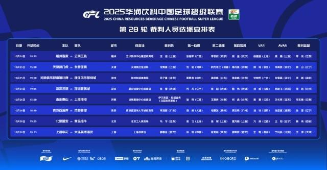 中超第28轮裁判安排公布
