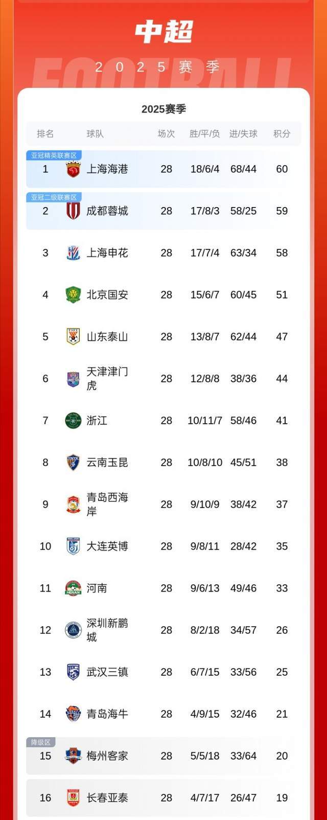 那边厢,位列积分榜第3位的上海申花,坐镇主场迎战大连英博。在大部分时间里,上海申花都是1-2落后对手的,直到长达13分钟的补时阶段,安德烈-路易的进球,才帮助上海申花追到2-2平, 至此,第28轮的4场焦点较量,可谓每一场都是冷门。领头羊上海海港被山东泰山逆转,积分榜次席的成都蓉城补时绝平青岛西海岸,积分榜第三的上海申花补时追平大连英博,北京国安补时连丢2球,惨遭青岛海牛逆转。 至此,本轮比赛,上海海港0分,成都蓉城1分,上海申花1分,北京国安0分。积分榜也因此有了微妙的变化,上海海港以60分继续领跑,成都蓉城追了一分,以59分位列第2位。上海申花58分,继续排在第3位。北京国安51分,维持在第4位。山东泰山47分排在第5位。
