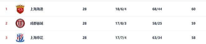 28轮之后,上海海港以60分排名榜首,成都蓉城、上海申花分别以59分、58分排名第2、3位。