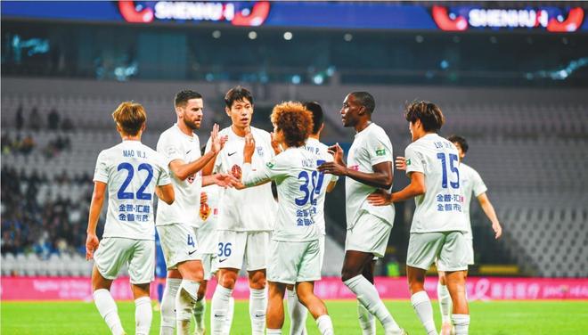 图为客战上海申花队,英博海发队球员庆祝进球。 大连英博足球俱乐部供图