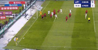 比赛第77分钟,法比奥斜传,张玉宁推射破门。北京国安客场3比0领先长春亚泰。