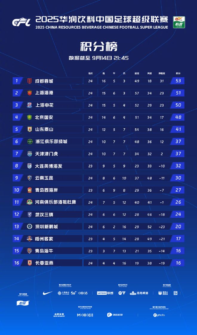 成都蓉城24轮后领跑,随后5轮1胜3平1负,提前1轮无缘争冠