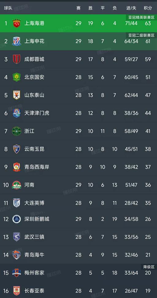 中超第29轮结束了三场比赛,最新积分榜如下!