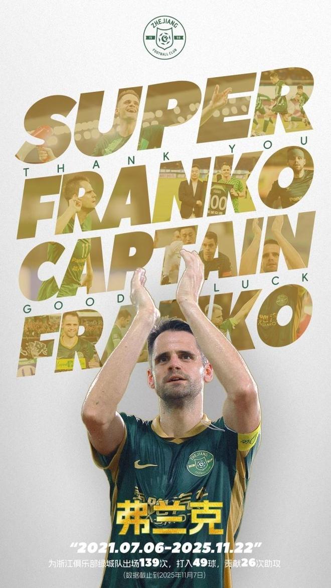 浙江俱乐部在官方公告中,向弗兰克表示深切感谢与诚挚祝福,并且盛赞这位克罗地亚中场:“他是浙江FC历史里闪耀的星,他是我们的队史外援出场王,是球队当之无愧的灵魂人物,也是浙江足球血脉里永远奔腾的江河。”