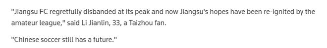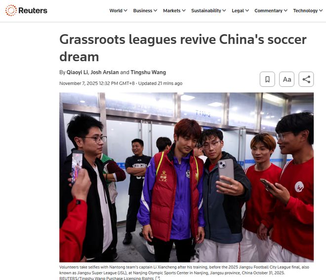路透社网站报道截图 路透社采访了一位来自泰州的球迷,他曾犹豫是否让儿子走足球道路,但14岁的儿子在7月观看泰州队战胜镇江队后坚定了踢球的决心。 报道指出,“苏超”的成功已引发中国多省效仿:辽宁去年推出联赛,河北和内蒙古8月成立联赛,湖南和四川则在9月开赛。 报道认为,业余联赛也正在初步打通中国足球职业化的通道。18岁的泰州队中场武之程,今年7月成为首位跻身中国顶级职业联赛——中超的球员。 报道称,南京奥体中心曾是江苏队的主场,这支球队曾聘请前英格兰主教练卡佩罗执教,球队于2020年夺得中超冠军,后因资金困局在巅峰期解散。“江苏队遗憾落幕,但如今江苏的希望被业余联赛重新点燃”,一位球迷说,“中国足球还有未来”。