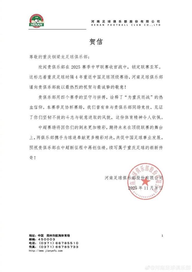 尊敬的重庆铜梁龙足球俱乐部 欣闻贵俱乐部在2025赛季中甲联赛收官战中,锁定联赛亚军。这标志着重庆足球时隔4年重返中国足球顶级赛场,河南足球俱乐部谨向贵俱乐部致以最热烈的祝贺与最诚挚的敬意! 贵俱乐部用四个赛季的坚守与拼搏,诠释了“为重庆而战”的热血信仰。本赛季足协杯赛场,我们曾有幸与贵俱乐部同场竞技,见证了你们坚韧不拔的斗志与锐意进取的风貌,这份体育精神令人钦佩。 中超赛场将因你们的到来更加精彩,期待未来在顶级联赛的舞台上,两俱乐部携手为球迷奉献更多精彩对决,共促中国足球事业发展。预祝贵俱乐部在中超新征程中再创佳绩,续写属于重庆足球的崭新传奇! |