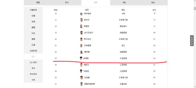 截至中超第29轮:吕焯毅以63次的过人总数,位居中超本土同位置第一;以4次助攻数,位居本土同位置第三。