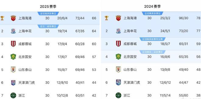 不少球迷肯定也看到,2024赛季和2025赛季中超前7名的排名完全一致,再仔细看今年冠军的积分比去年少了12分(上图)。这意味着,相比去年,今年的中超水平又下降了。这种情况下,依然比较舍得花钱,也有钱可花的上港再次夺冠就不奇怪了