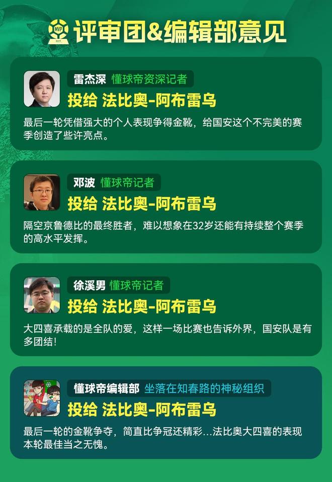 在中超第30轮北京国安主场5-1击败梅州客家的比赛中,法比奥先是接柏杨传中头球首开记录,又接王刚传中头球扩大比分;下半场张稀哲的传中帮助法比奥面对半空门完成帽子戏法,比赛临近结束法比奥在禁区内凭借个人能力穿郭全博小门实现大四喜。 正是最后一粒进球,帮助法比奥在一场隔空的“京鲁德比”中以一球之差击败卡扎伊什维利,收下2025中超赛季金靴。最终,综合球迷投票、评审团投票、编辑部投票三部分,法比奥以68%的得票率,大幅领先其他候选,当选中超第30轮MVP。