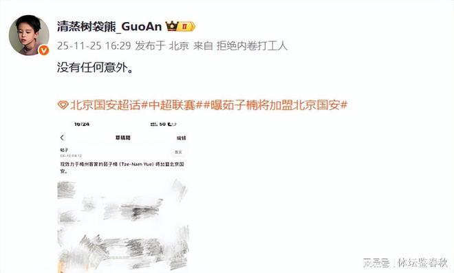 近日,一位资深北京足球博主在社交媒体上发文称,北京国安已经正式敲定签下梅州客家主力右边卫茹子楠,这位27岁的中国香港国脚将在下个赛季身披国安战袍征战中超联赛。此前,有不少媒体爆料上海海港将引进茹子楠,但国安还是最终胜出。