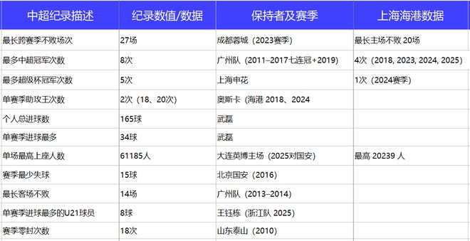 穆斯卡特谈及在中超执教所面对的问题——外界说你们用这种踢法不可能成功。什么踢法?就是传控+进攻式足球。2024赛季他刚执教海港时,赛季前有记者将其说成是“恐怖打法”。 面对质疑,如今的穆斯卡特证明了自己。他接着说道:“但我们做到了,还打破了中超历史上所有的纪录 —— 进球数、积分、胜场数,只要你能想到的,都被我们改写了。” 海港已打破中超历史上所有纪录?从客观数据看,穆斯卡特这话多少有王婆卖瓜的成分。因为还有很多中超的纪录至今上港也无法打破,比如广州恒大的七连冠等等。下图列举出了一些“能想到的”中超纪录。