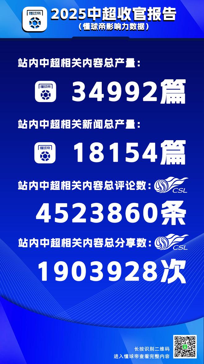 2025赛季是一个充满话题的赛季,联赛争冠、金靴争夺、保级大战、年轻球员涌现、球迷争端……在这一个赛季的时间里,共有接近3.5万篇中超相关内容在懂球帝上线,其中新闻内容占据1.8万篇,超过所有中超内容的50%,我们一如既往地为大家呈现了来自懂球帝以及各方的消息。 而在这一个赛季的时间里,我懂球迷为中超联赛贡献了超过450万条评论。在我懂的评论区总是能够见到有趣的梗和梗图、颇有深度的见解以及充满温情的故事。 信息是需要传播的,在这一个中超赛季里,懂球帝站内的中超内容共得到了超过190万次的分享。每一位分享内容的球迷都是信息的传播者,感谢我懂球迷能够将内容分享出去,让更多人能够了解到联赛中发生的种种,以及产生的各种消息。