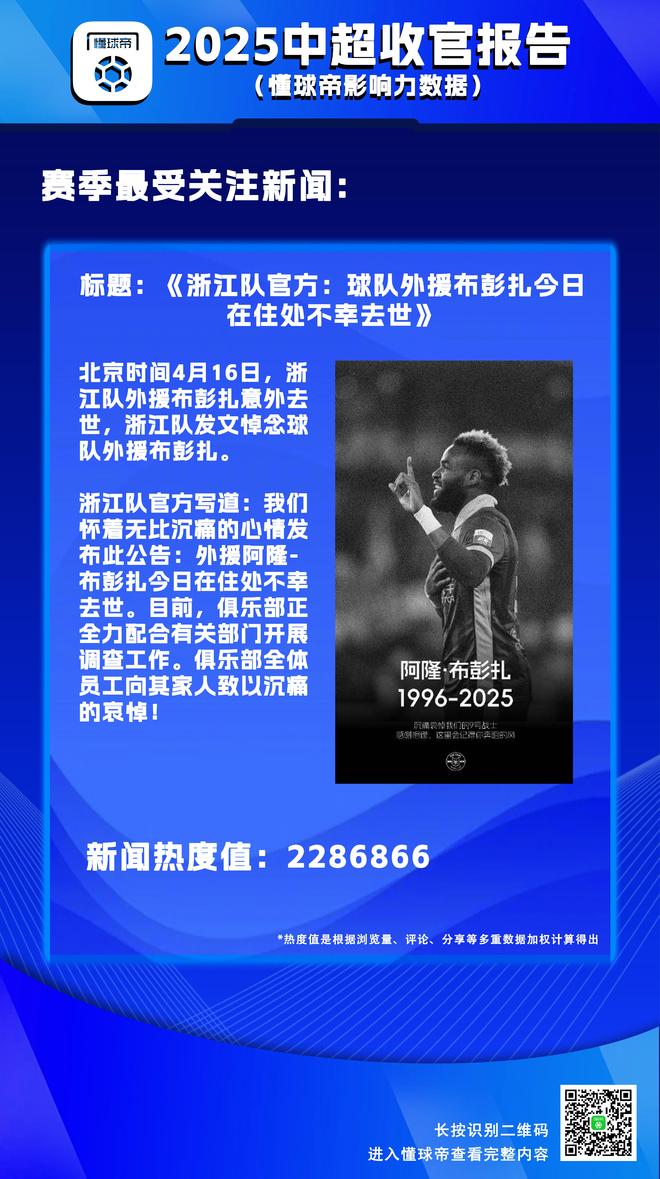 一个赛季,总会有一些让人能够牢牢记住的事情。有的是好的、快乐的,有的则是悲伤的。 在本赛季中超联赛中,最受人关注的新闻是浙江队外援布彭扎去世的新闻。现在我们还记得当时的那个下午,懂球帝编辑部在看到外媒的相关报道时的那种错愕。 对于这样的内容,我们处理的原则一定是慎之又慎,在相关消息曝出后,有的同事在监控信息,有的则是在求证不同信源,为的是尽可能准确地报道出相关信息,同时也尊重逝者,不希望他和爱他的人们受到失实信息的打扰。