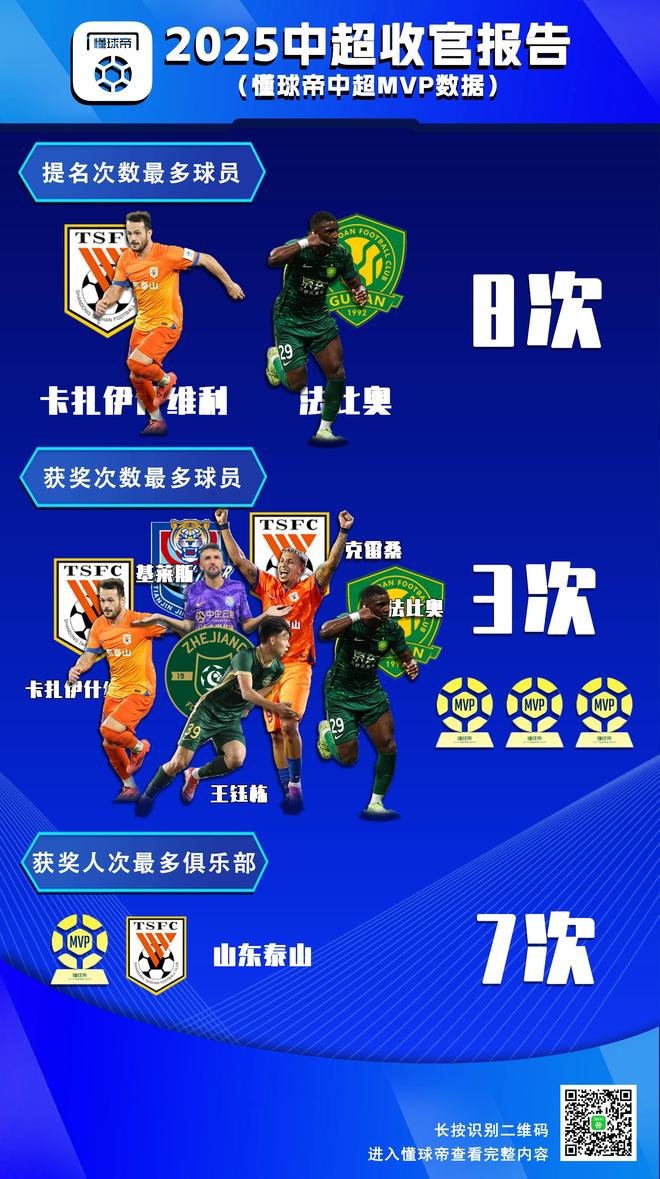 在本赛季懂球帝中超MVP候选提名方面,瓦科和法比奥这一对同年同月同日生的金靴争夺对手都得到了8次提名。而两人整个赛季也均3度摘得懂球帝中超MVP,分别收获了三座我懂奖杯。 此外,除了瓦科和法比奥之外,还有基莱斯、王钰栋以及克雷桑本赛季都拿到了3座懂球帝中超MVP奖杯,这5位球员也包揽了本赛季一半的懂球帝中超MVP的奖项。