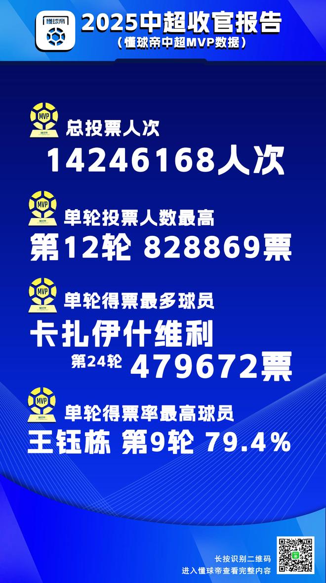 本赛季30轮的懂球帝中超MVP评选中,共收到了约1425万人次的有效投票,这一数据相比于去年的1178万人次提升了近21%。 其中,单轮投票人数最高的是第12轮,达到了828869人次,这一数据也是历年懂球帝中超MVP评选中,人数最高的一次。 此外,本赛季单轮得票最多的球员是卡扎伊什维利,他在第24轮共收获了479672张票。在那一轮对阵上海申花的比赛中,瓦科凭借着自己的帽子戏法,战平了强敌上海申花,他也因此实现了连场戴帽的成就。 得票率方面,王钰栋在第9轮的比赛中得到了79.4%的得票率。在那场比赛中,他打入了一记世界波,进球后,王钰栋眼含热泪与队友双手指天,悼念着刚刚离世的队友布彭扎。