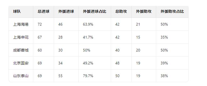 在大多数中超球队都更青睐中前场外援的情况下,一支球队的总进球数、助攻数,从一定意义上来讲,也能侧面反映出球队对于外援的依赖程度。