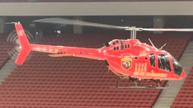 当直升机慢慢接近,眼尖的球迷发现,这架直升机的机身上居然印着海港队徽(下图)。这一幕实在震撼人心。不知道这是不是海港俱乐部专属的直升机。俱乐部财力十足,足以让很多囊中羞涩的中超同行羡慕不已!