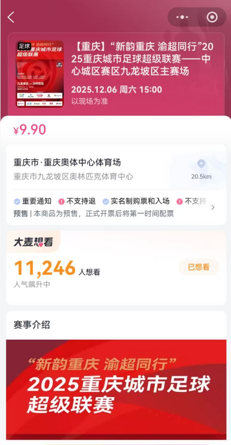 2014年10月25日,重庆力帆在重庆奥体中心完成冲超并庆祝夺得中甲冠军。重庆奥体中心官网图 2014年10月25日,在2.15万重庆球迷的见证下,重庆力帆在1比1战平沈阳中泽后,以17胜10平2负积61分的骄人成绩冲超成功,赛后还举行了中甲冠军颁奖仪式,这也是重庆足球的高光时刻。 2015年8月23日,重庆力帆主场1比0绝杀“老冤家”石家庄永昌。当时石家庄永昌16轮不败风头正盛,力帆队长王栋又和对方球迷有恩怨故事,比赛戏剧性拉满,第91分钟王栋接程谋义传球,打进了职业生涯第100个进球。重庆球迷还在这场比赛中展示了当时中超最大的TIFO“我的主场”。 2016年3月6日,重庆力帆在中超首轮大爆冷门,主场2比1击败广州恒大。这场比赛力帆外援费尔南多用两次长途奔袭破门,点燃了重庆球迷的热情,也让全国球迷知道了“小摩托”这个绰号,事后力帆集团甚至推出了费尔南多限定版摩托。 12月6日,九龙鑫源熊猫队将在重庆奥体中心迎战沙坪坝陈昌银队,两队实力相近且都是“渝超”出线热门球队,两队有望复刻9月13日“渝超”揭幕战的精彩。 “渝超”带来抢票热潮 虽然距离12月6日比赛开赛还有几天,但重庆球迷已经行动了起来,12月1日记者从渝州十二卫球迷协会了解到,目前通过该协会预约的球迷人数已经超过了800人。该协会会长林伟告诉记者:“我们在几天前发出了重回奥体看球的征集令之后,报名人数一直都在增加,目前人数超过了800人,有望在12区组成一个千人方阵。” 重庆球迷协会秘书长胡伦同样透露,该协会在忙完U17国家队助威以及龙之队球迷会年会之后,也在组织球迷重回奥体助威。“我们主要会在9区组织球迷,这也是我们当年在奥体看球的区域。大家积极性都很高,都说好久没回奥体看球了。”胡伦说道。