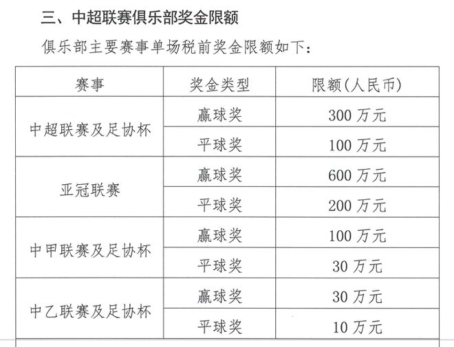 球员薪酬方面,国内球员(含港澳台)个人年薪税前上限为:中超500万元、中甲300万元、中乙120万元。国内球员平均年薪亦设限:中超不超过300万元、中甲150万元、中乙50万元。