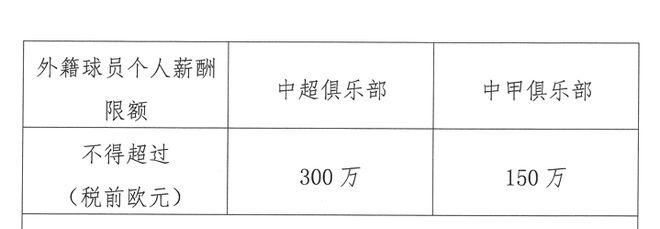 外籍球员个人年薪上限为中超300万欧元、中甲150万欧元;俱乐部外援薪酬总额上限为中超1000万欧元、中甲400万欧元。