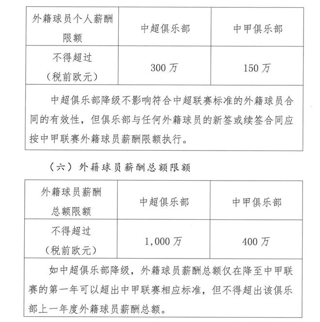 通知还规定,外籍球员年薪限额分别为:中超不超过税前300万欧元、中甲不超过税前150万欧元。外籍球员薪酬总额限额为:中超不超过税前1000万欧元、中甲不超过税前400万欧元。