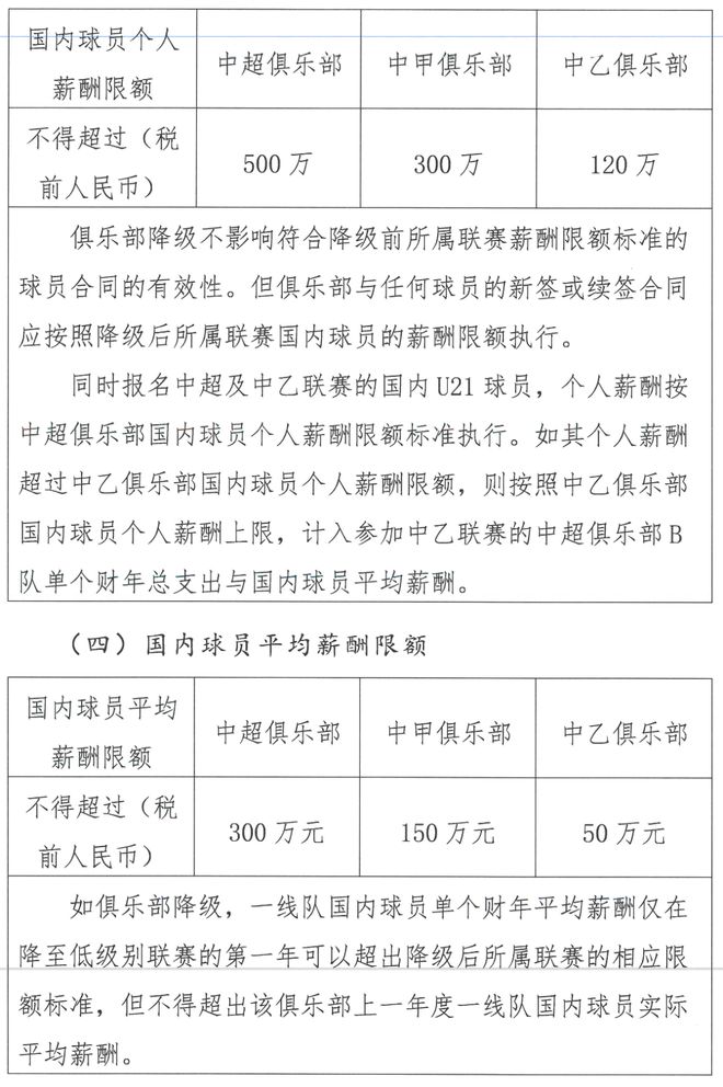 本文字数:519,阅读时长大约1分钟 来源 | 长安街知事 12月3日,中国足球职业联赛联合会发布《关于印发中国足球职业联赛俱乐部财务约定指标的通知》,明确了球员个人薪酬限额。 通知规定,中超俱乐部年度支出不得超过6亿元人民币,这其中包括青训费用和女足费用;中甲为不超过2亿元,中乙为不超过5千万元。 在备受关注的球员薪酬方面,国内球员(含港澳台球员)年薪限额分别为:中超不超过税前500万人民币、中甲不超过税前300万人民币、中乙不超过税前120万人民币。 国内球员(含港澳台球员)平均薪酬限额分别为:中超不超过税前300万人民币、中甲不超过税前150万人民币、中乙不超过税前50万人民币。