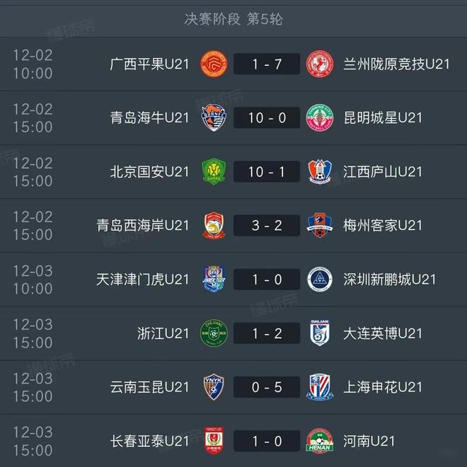 L组(9-16排位组) 青岛海牛10-0昆明城星 这是一场一边倒的比赛,姚子诺上演大四喜,刘千硕梅开二度,张瑞琦、郭富鑫、郭文浩、谈兆然各进一球。青岛海牛10球大胜昆明城星。 北京国安10-1江西庐山 国安同样进了10个!王子皓上演帽子戏法,张昊冉梅开二度,许科斯、蒋子承、刘科宏、王宇翔、任正旗各进一球,江西由刘续泽打进挽回颜面的一球。最终,国安10-1大胜江西庐山。 青岛西海岸3-2梅州客家 第27、43分钟,陈玮欣、李汶聪各入一球,梅州客家2-0领先。易地再战,第53分钟,栾昊破门扳回一球,西海岸1-2。第71、74分钟,金凯、林明建破门,西海岸完成大逆转!最终,青岛西海岸3-2战胜梅州客家。 广西平果1-7兰州陇原竞技 广西平果太差了!禹椋上演帽子戏法,徐奥冉、黄吉良、申由、胡焱博破门。毛略为广西队打进挽回面的一球,最终兰州陇原竞技7-1大胜广西平果。