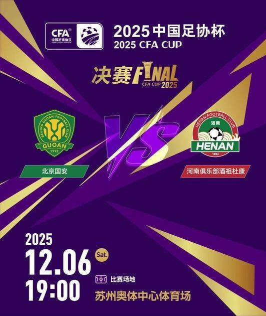 2025中国足球协会杯决赛 将于6日晚 在苏州奥体中心打响 北京国安队和河南队 将争夺冠军