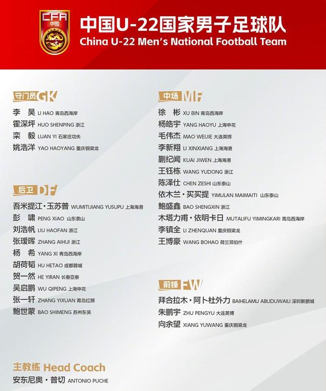 U23亚洲杯将于2026年1月6日开赛,比赛在沙特阿拉伯举行。北京时间12月4日下午,中国足协公布了U22国足12月集训并参加U23亚洲杯的29人大名单,其中王钰栋、徐彬、王博豪等人入选,刘诚宇、玄智健、汪士钦、陈哲宣落选,门将召入姚浩洋,后防线召入了张一轩和吴启鹏。