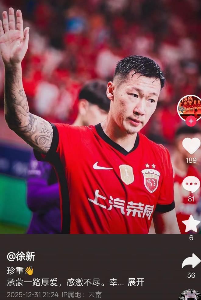 31日晚,徐新在个人社交账号上发文,告别效力了4个赛季的上海海港。徐新写道:“承蒙一路厚爱,感激不尽。幸与诸君同舟,此间风景,终生难忘。明日各有征程,唯愿珍重,且待佳音。江湖不大,我们后会有期。” 2022赛季,徐新转会加盟上港。效力4个赛季,其代表球队总计出场101场,攻进3球并送出4次助攻,随队夺得3次中超联赛冠军以及1次足协杯冠军。本赛季,徐新总计出场19场,斩获1球3助攻的数据,并随队实现联赛三连冠。