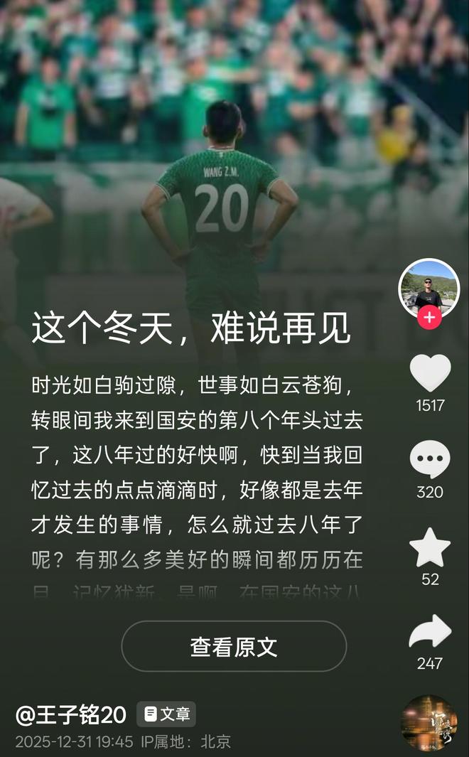 同样发文告别的还有北京国安的王子铭。王子铭在告别中表示,自己非常荣幸和满足在国安收获的诸多感动,表示无论在哪都会关注和支持国安。 王子铭从2018赛季加盟国安,至今已有8个赛季,总共代表国安出战185场比赛,攻进36球并送出5次助攻。本赛季王子铭共出场17场,收获5粒进球,并随队夺得国安队史第五座足协杯冠军奖杯。